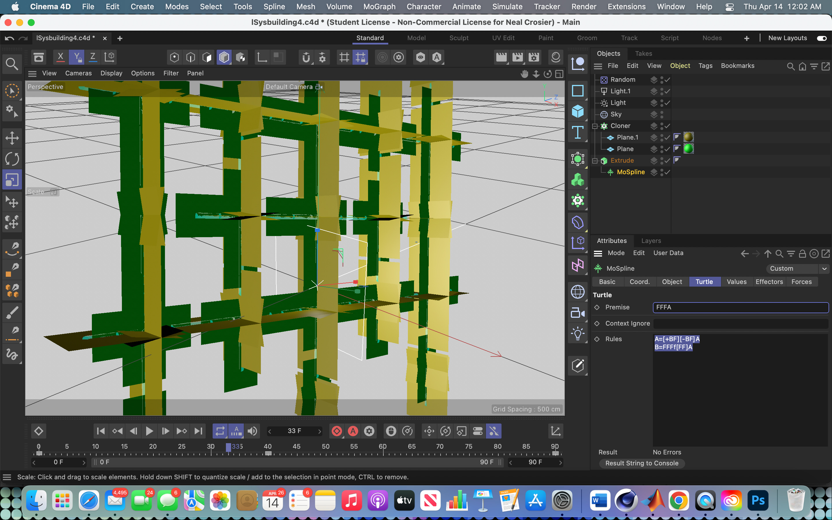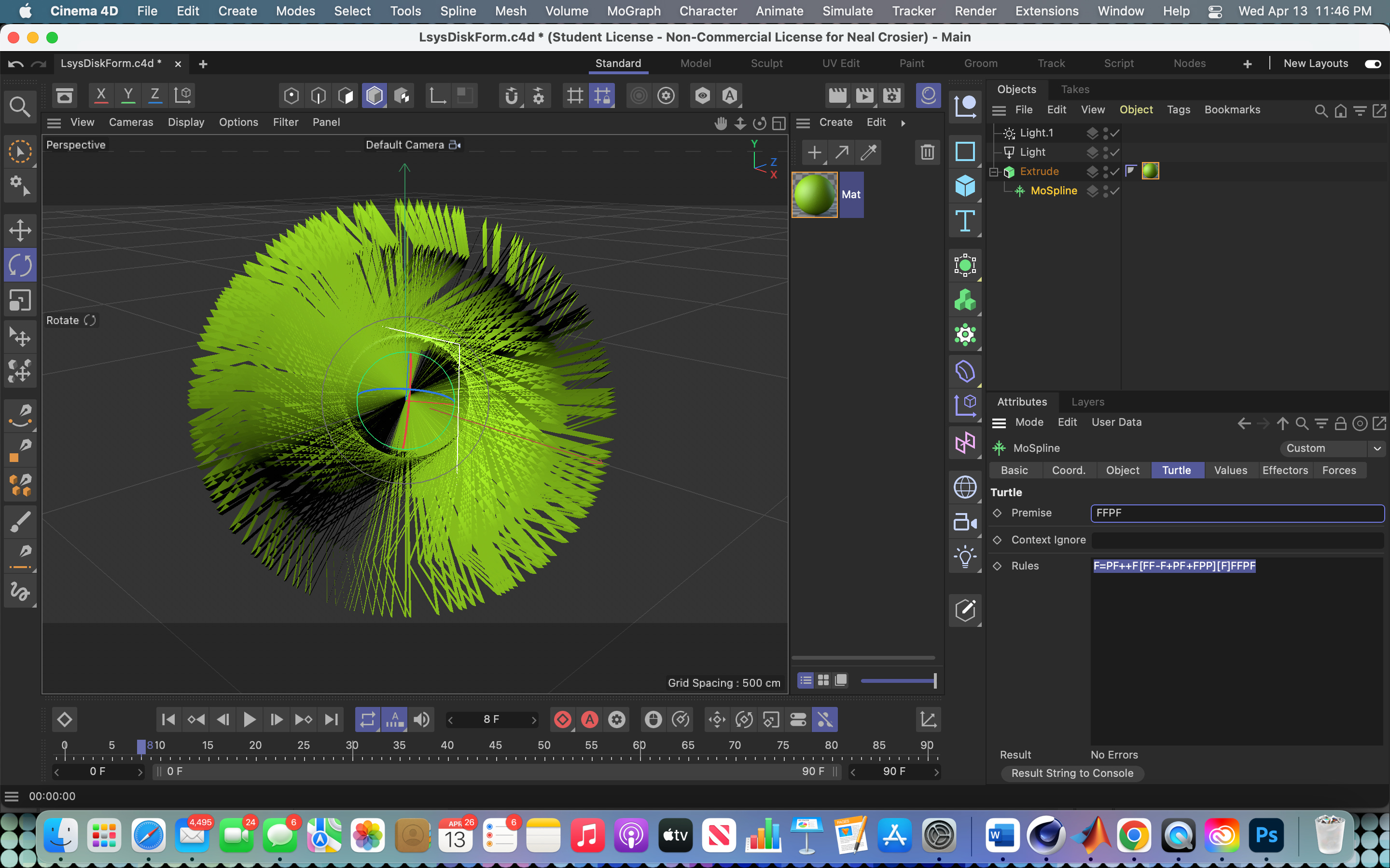 Hidden in mospline is the turtle graphics which implements the Lindenmayer system. It accepts a totally different type of formula. Using the turtle function in Cinema 4D you can create L system graphics. After opening a new project, you click on mospline and then on the turtle tab. Here you can set parameters such as the angle in degrees and use the slider to set the iteration numbers. Under the turtle parameters tab of this section, you type the premise and the rules for replacement.