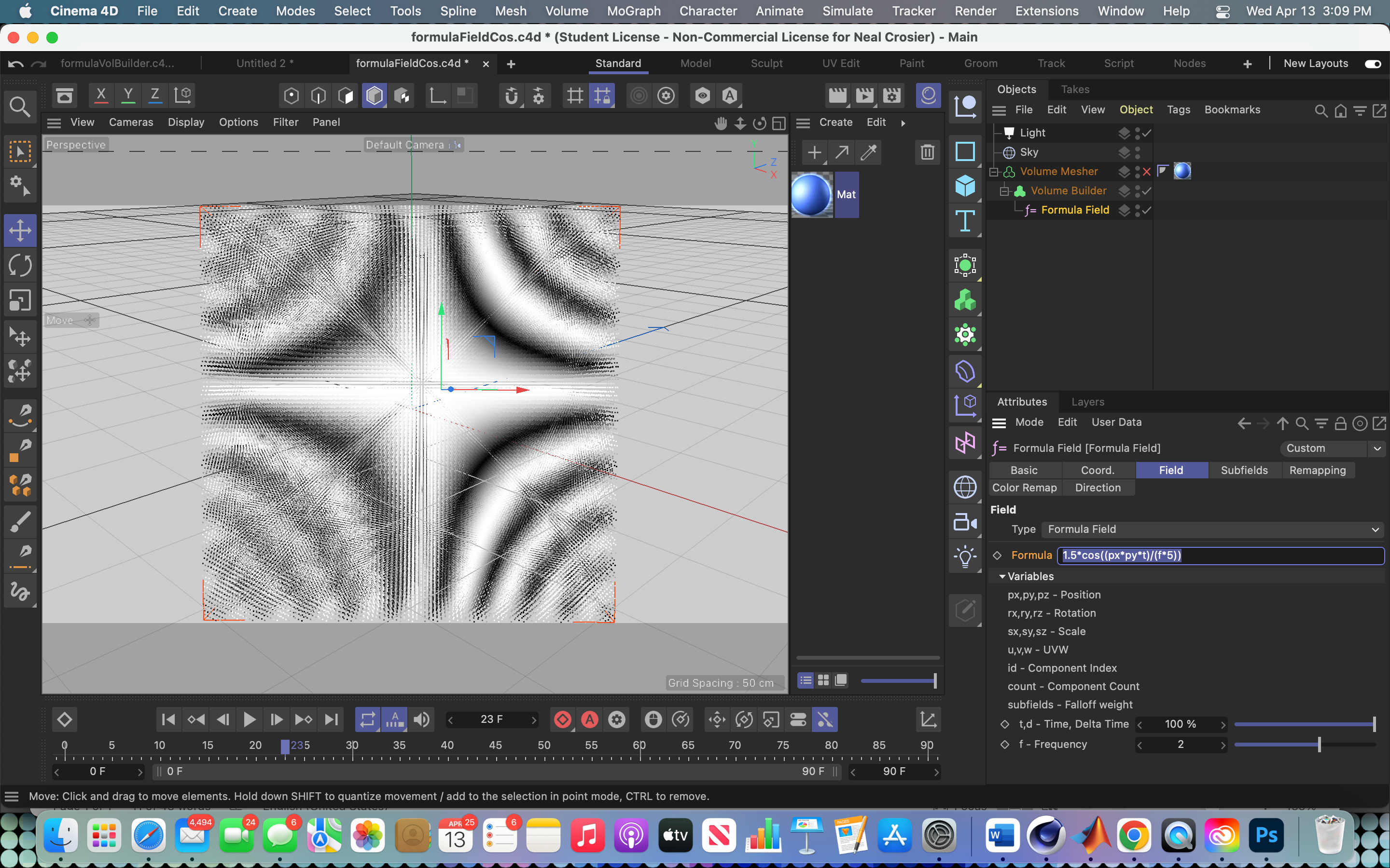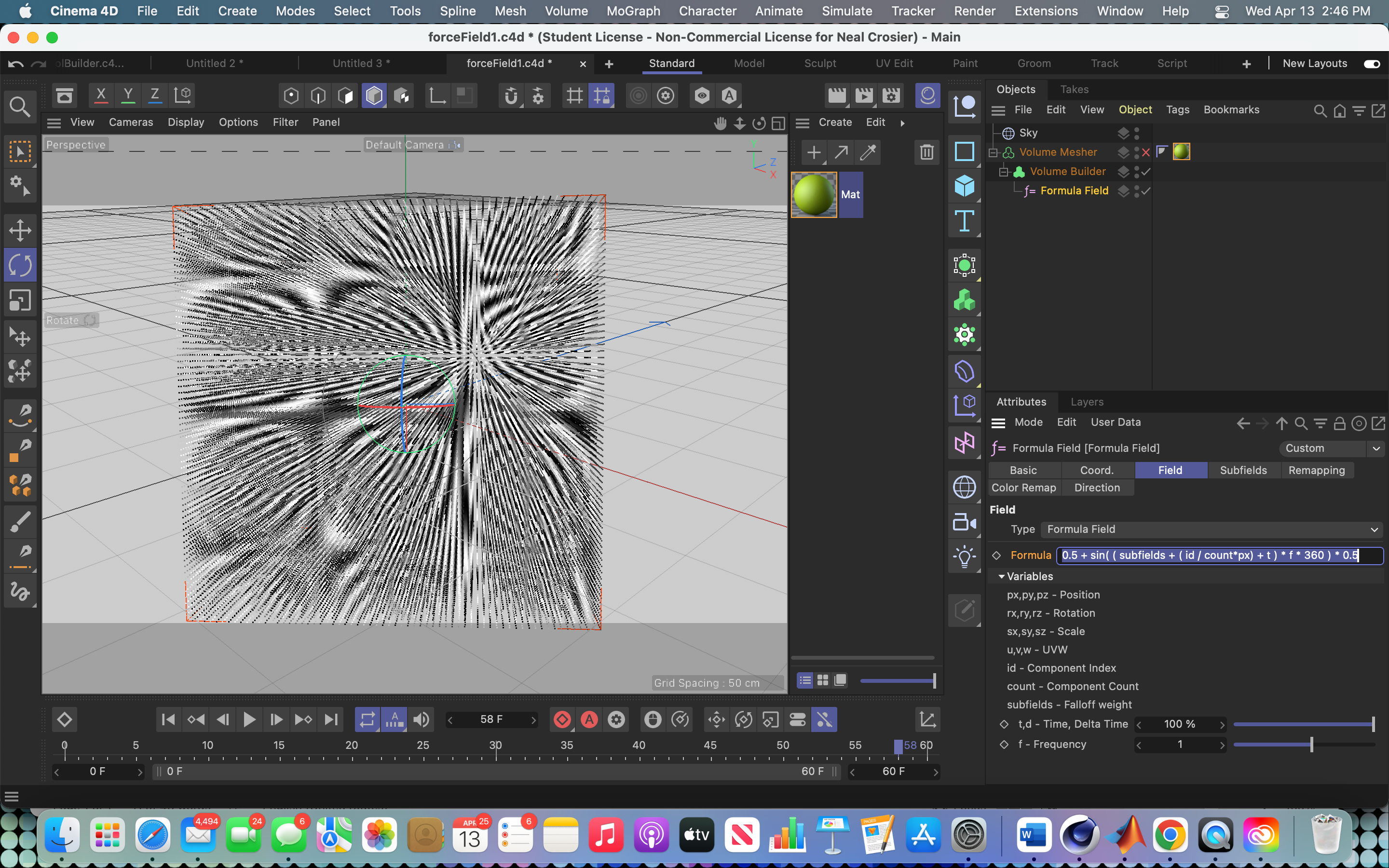 The formula field is yet another place in Cinema 4d where you can use mathematical formulas. When you open the formula field, it comes with a default formula already there. The formula field must be put into a volume builder to see the field in the viewport. Here is the default formula, slightly modified, with the volume builder set to fog.
