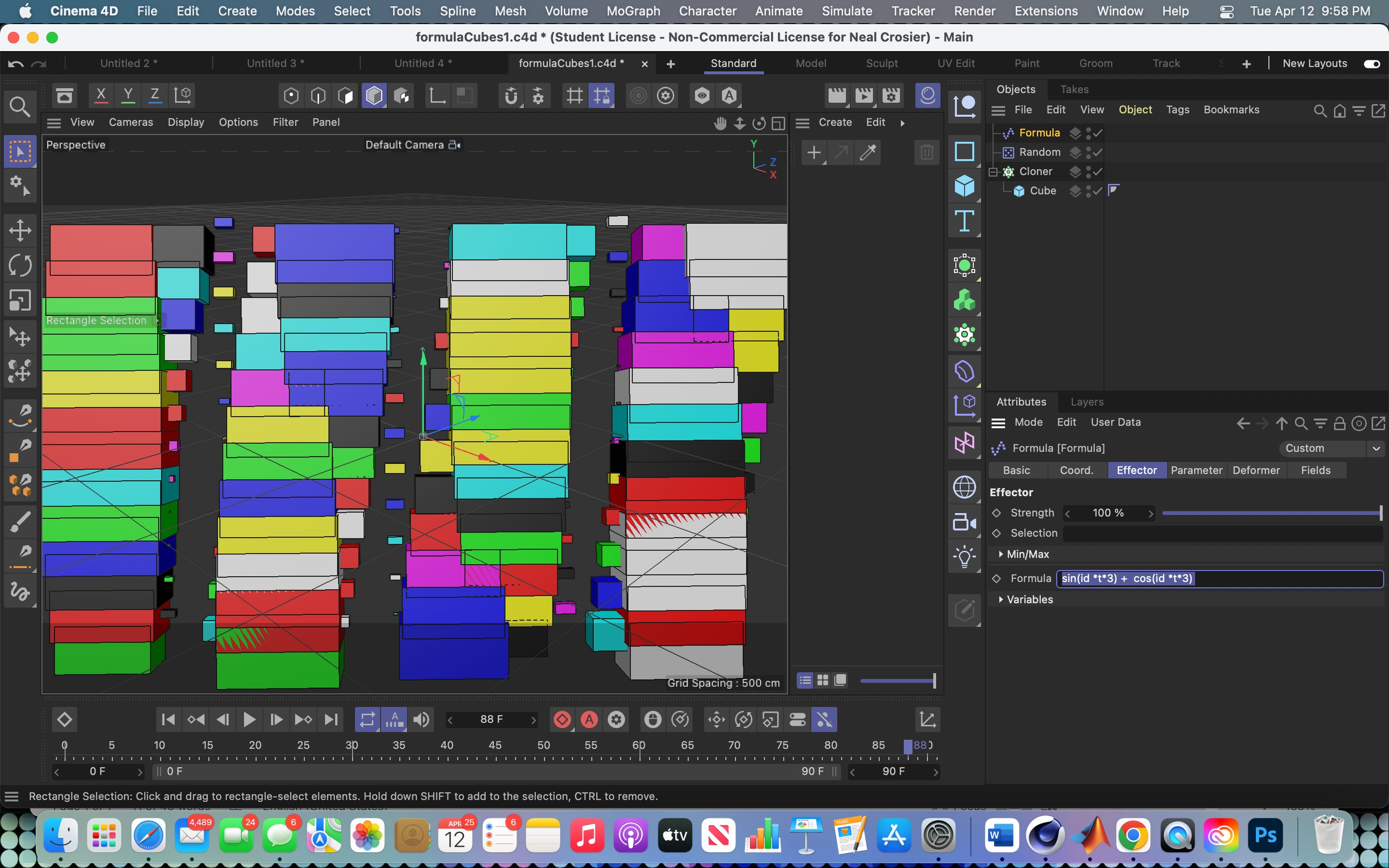 Formula effectors use a formula, in this case a trigonometric formula, to drive the animation of objects. Here I used the formula: sin(id *t*3) + cos(id *t*3) to animate a grid of cubes. The variable id refers to the id number of each of the clones, that are numbered from 0 to n-1 for n clones. The cube is dropped into a cloner to create the grid of cubes. Then I placed a formula effector in the effector field for the cloner to control the animation. The random effector is just for a random color scheme for the cloned cubes.