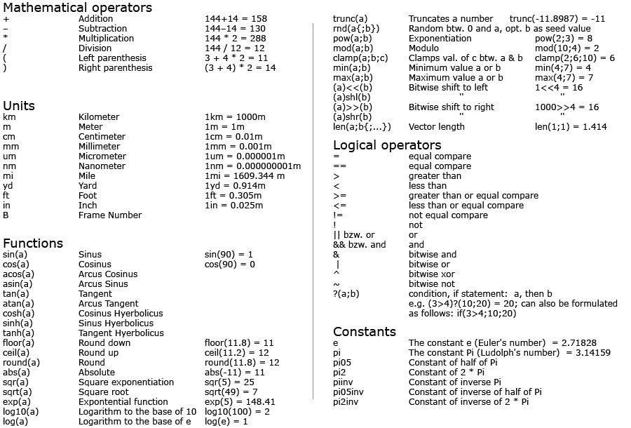 Here is an exhaustive list of the operators, functions, and constants that can be used in formula fields throughout Cinema 4d. There are a few differences from other common programming languages. For example, is not x^2 like in Matlab, rather it is pow(x; 2) and sin(x*y) would be Sin(px*py) in Cinema 4d. However, the differences are really minimal.